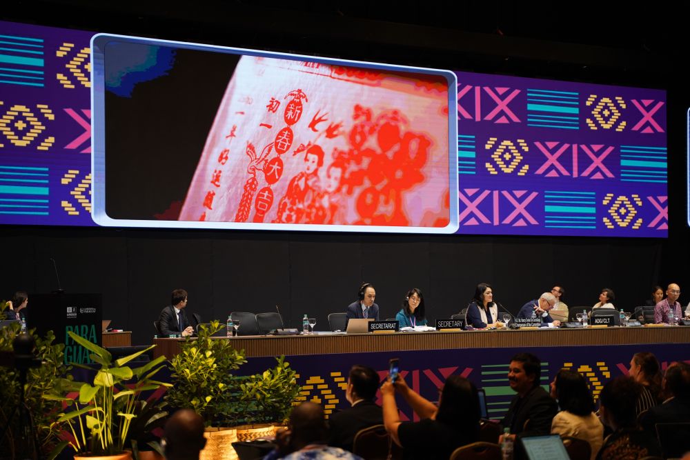 12月4日,在巴拉圭亞松森聯(lián)合國教科文組織保護非物質文化遺產(chǎn)政府間委員會第19屆常會評審現(xiàn)場,大屏幕播放春節(jié)宣傳視頻。新華社記者朱雨博攝