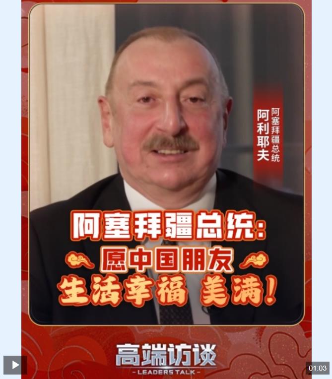 近日,阿塞拜疆總統(tǒng)阿利耶夫送上蛇年新春祝福,祝中國(guó)人民新春快樂。阿利耶夫說:“祝愿所有朋友生活美滿,內(nèi)心平靜 ,擁有穩(wěn)穩(wěn)的幸福?!贝烈曨l,看阿利耶夫還說了什么↑