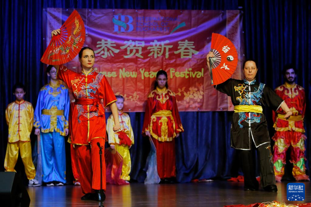 1月31日,在羅馬尼亞布加勒斯特國(guó)際學(xué)校,羅馬尼亞武術(shù)愛(ài)好者在新春聯(lián)歡會(huì)上表演。新華社發(fā)(克里斯泰爾攝)