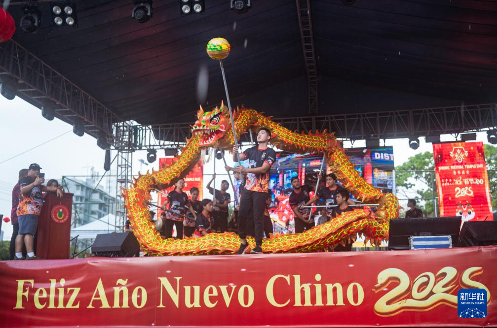 這是1月31日在巴拿馬首都巴拿馬城的華僑華人歡樂(lè)春節(jié)廟會(huì)上拍攝的舞龍表演。新華社記者 許詠政 攝
