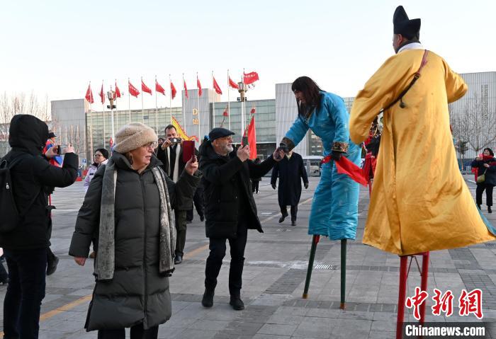 2月7日,駐華使節(jié)團成員與踩高蹺表演者交流。中新社記者 翟羽佳 攝