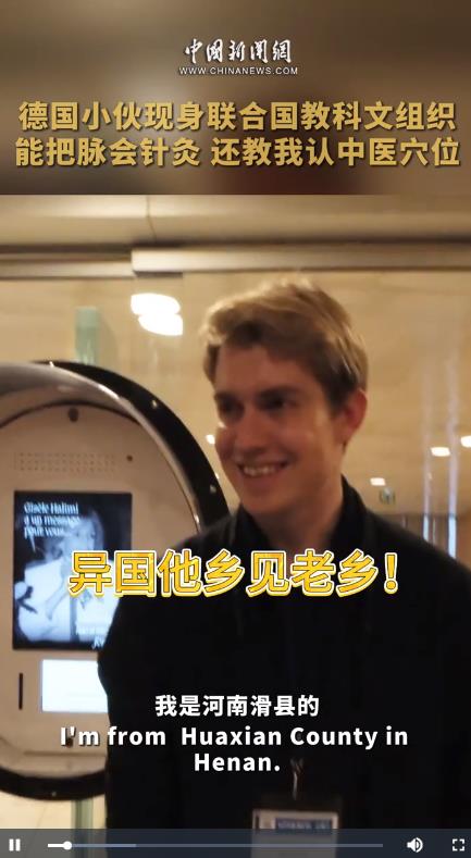 由中國常駐聯(lián)合國教科文組織代表團(tuán)與河南衛(wèi)視共同舉辦的“我們的春節(jié)”慶?;顒赢?dāng)?shù)貢r間6日晚在位于法國巴黎的聯(lián)合國教科文組織總部華美亮相?;顒蝇F(xiàn)場,記者遇到德國小伙推介中醫(yī)文化。這位名叫“無名”的德國小伙,早已憑借地道的河南話和對中醫(yī)的熱愛多次爆火出圈。在法國巴黎聯(lián)合國教科文組織總部,參與“我們的春節(jié)”活動之余,無名還開啟了中醫(yī)小課堂。(王高飛)