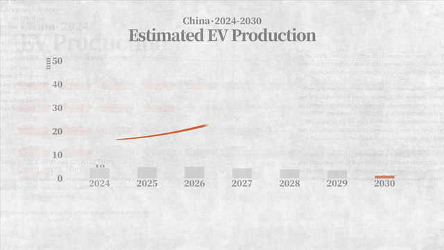 國際能源署也指出,到2030年,電動汽車需要有4500萬輛,才能實(shí)現(xiàn)氣候目標(biāo)。中國2024年的電動汽車產(chǎn)量是1000萬輛,只占該目標(biāo)的22%,即使保持高增長速度,到2030年也不太可能“產(chǎn)能過?!?。