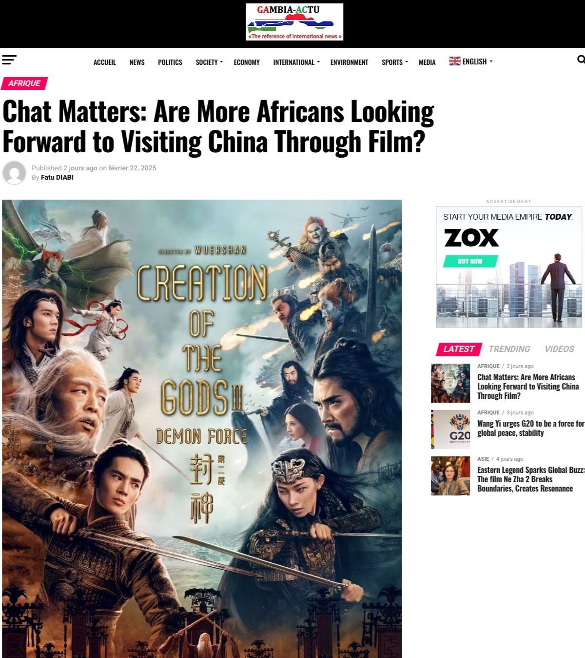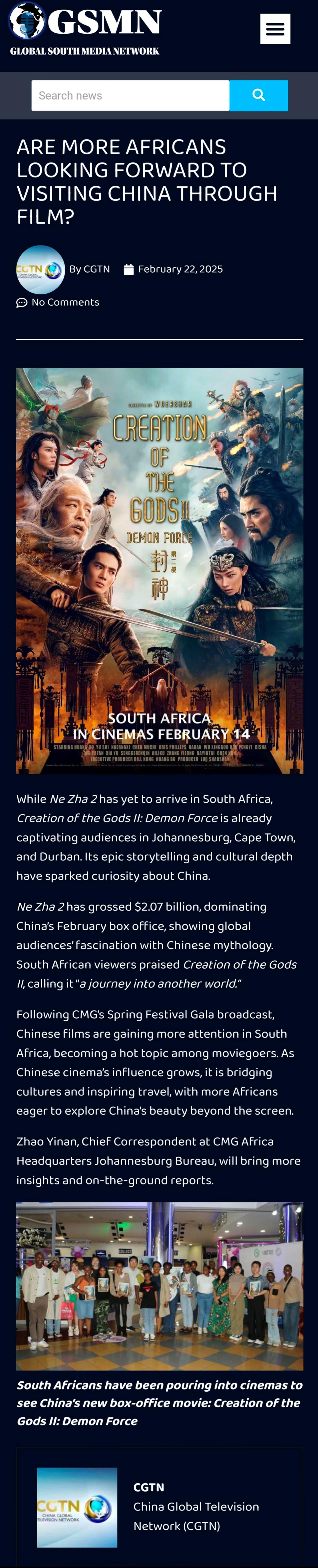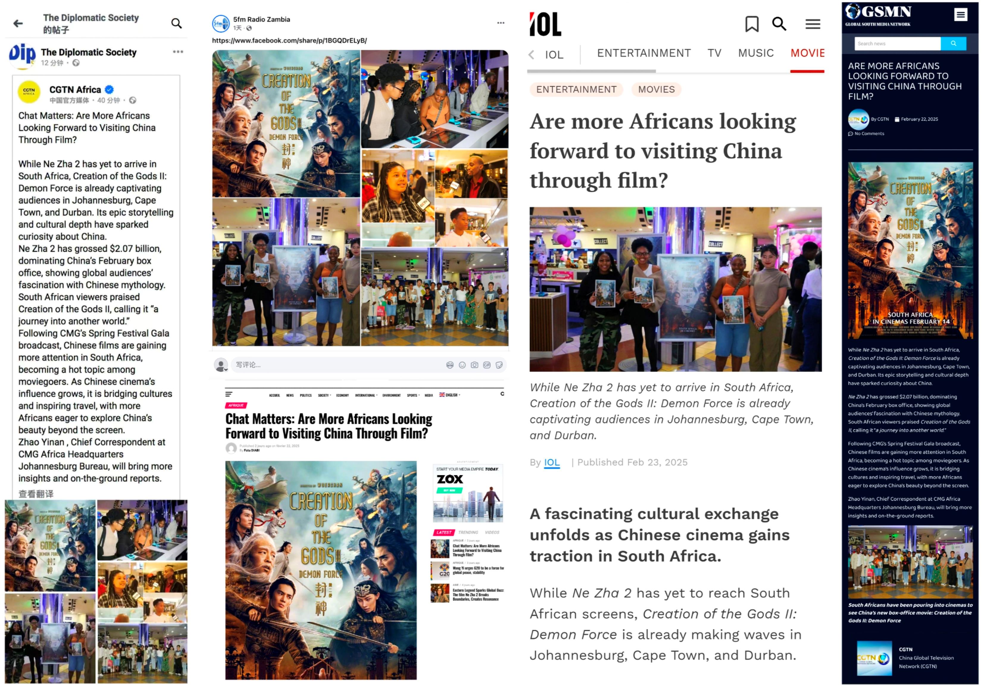 此外,中國春節(jié)檔電影登陸非洲并引發(fā)廣泛影響的相關(guān)報(bào)道被肯尼亞廣播公司、南非獨(dú)立傳媒、南非《外交圈報(bào)》、全球南方新聞網(wǎng)、贊比亞5fm電臺(tái)、津巴布韋廣播公司、岡比亞之聲、剛果新聞網(wǎng)等多家媒體轉(zhuǎn)引轉(zhuǎn)載,觸達(dá)超1億受眾。