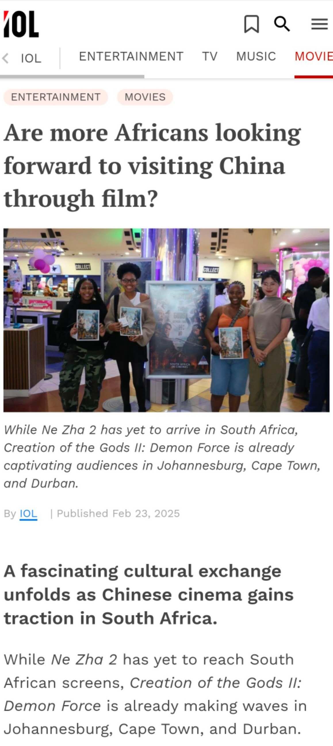 電影連接世界,這一次,非洲大陸期待著《哪吒2》的到來,曼德拉廣場上舞動(dòng)著南非版的“魔童鬧?!薄侵迺r(shí)刻已到——This time for Africa!