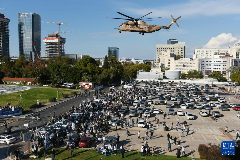 1月25日,搭載獲釋以色列被扣押人員的直升機(jī)抵達(dá)以色列佩塔提克瓦的一所醫(yī)院。新華社/基尼圖片社