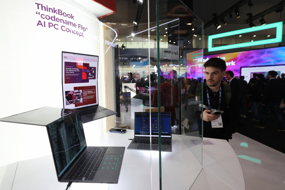 3月3日,在西班牙巴塞羅那舉行的2025年世界移動通信大會上,一名男子在聯(lián)想展區(qū)參觀外折屏筆記本電腦ThinkBook Flip AI PC概念機。(圖片來源:新華社)