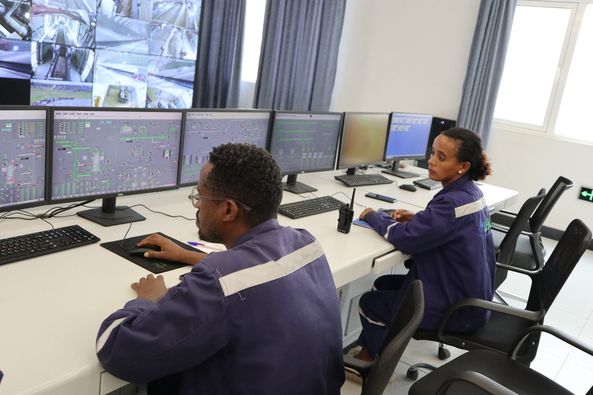 3月5日,當?shù)貑T工在埃塞俄比亞萊米國家水泥廠的中控室工作。(圖片來源:新華社)