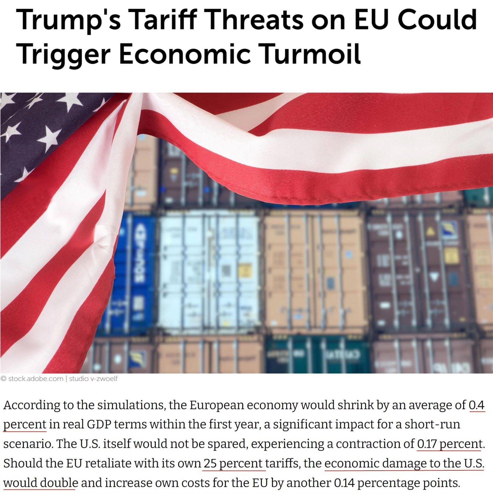 據(jù)德國(guó)基爾世界經(jīng)濟(jì)研究所此前推算,如果美國(guó)計(jì)劃中的關(guān)稅措施全部落地,歐盟和美國(guó)經(jīng)濟(jì)在第一年將分別萎縮0.4%和0.17%。如果歐盟以25%的關(guān)稅加以反制,美國(guó)的經(jīng)濟(jì)損失將翻倍。