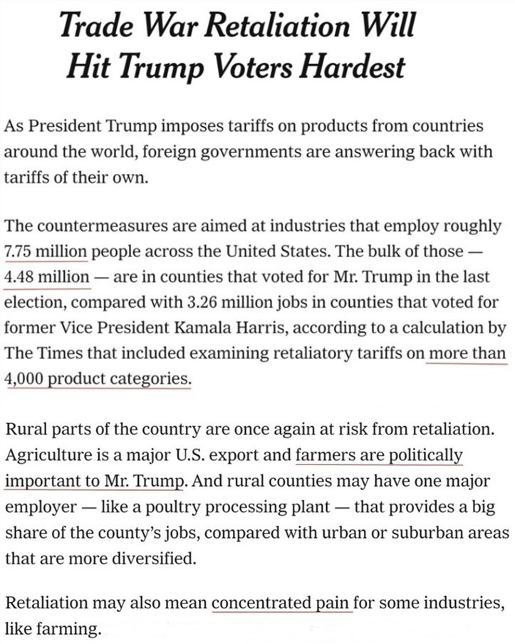 《紐約時(shí)報(bào)》對(duì)美國(guó)遭受反制關(guān)稅打擊的4000多個(gè)產(chǎn)品類別進(jìn)行的分析顯示,各行業(yè)共有約775萬(wàn)人受到波及,其中約有448萬(wàn)人來(lái)自大選中支持特朗普的地區(qū),主要集中在以農(nóng)業(yè)為主要產(chǎn)業(yè)的美國(guó)中西部、南部和東南部。
