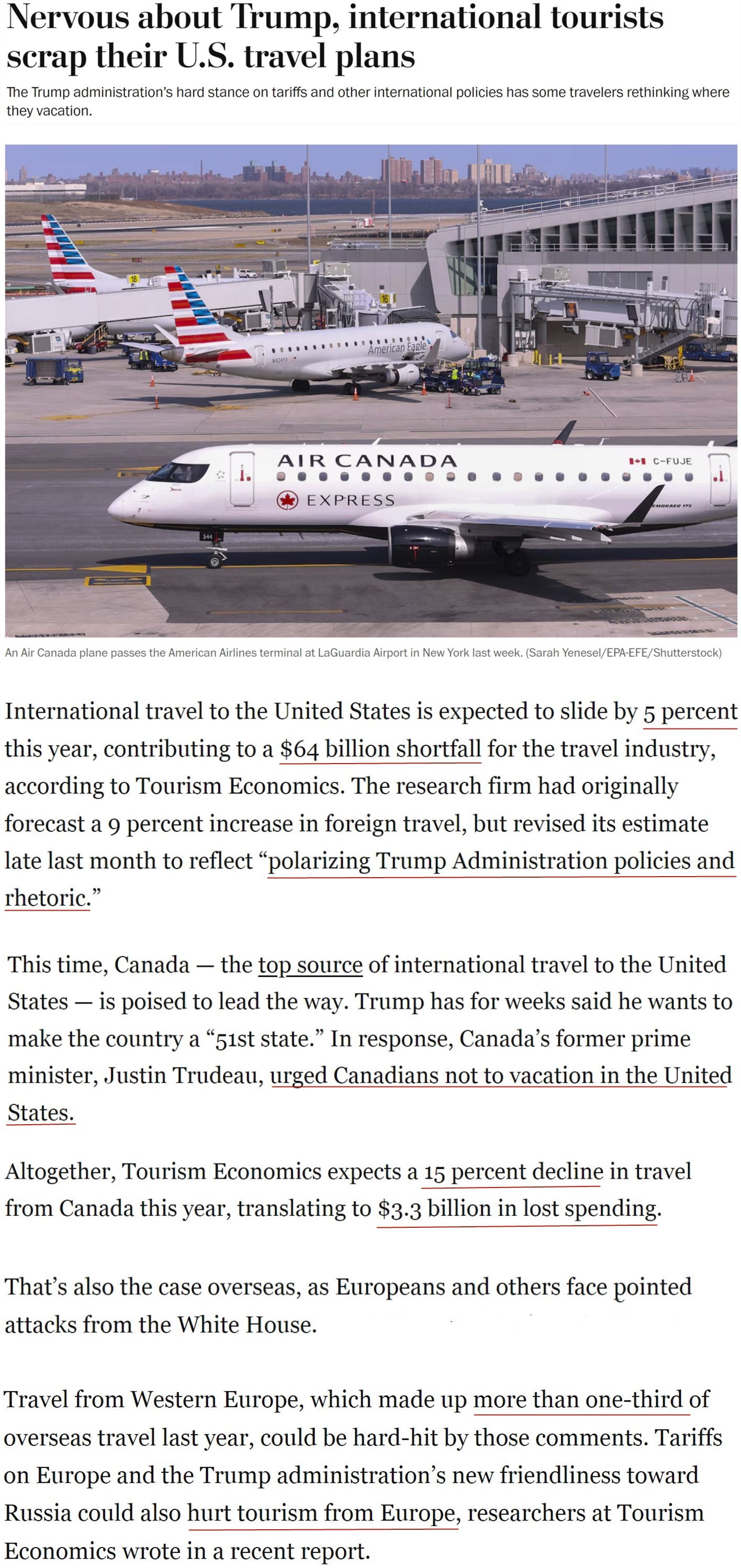 或許更讓美國(guó)始料未及的是,外國(guó)游客也被關(guān)稅“氣”跑了。