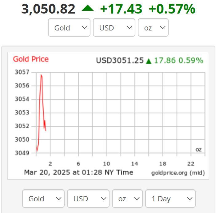 △當(dāng)?shù)貢r(shí)間20日開(kāi)盤(pán)后,紐約商品交易所現(xiàn)貨黃金價(jià)格一度接近每盎司3057美元(圖自國(guó)際金價(jià)網(wǎng)站)