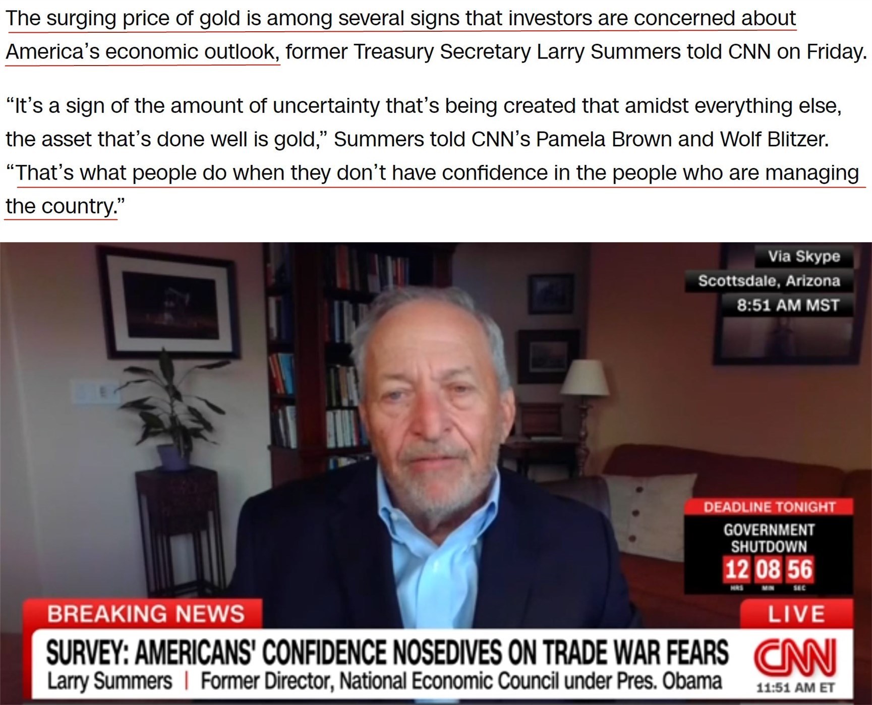 美國(guó)前財(cái)政部長(zhǎng)勞倫斯·薩默斯在接受采訪時(shí)表示,特朗普反復(fù)無(wú)常的政策和言行正在侵蝕全球市場(chǎng)對(duì)美元的信任,金價(jià)的大漲正是這種不確定性的體現(xiàn)。