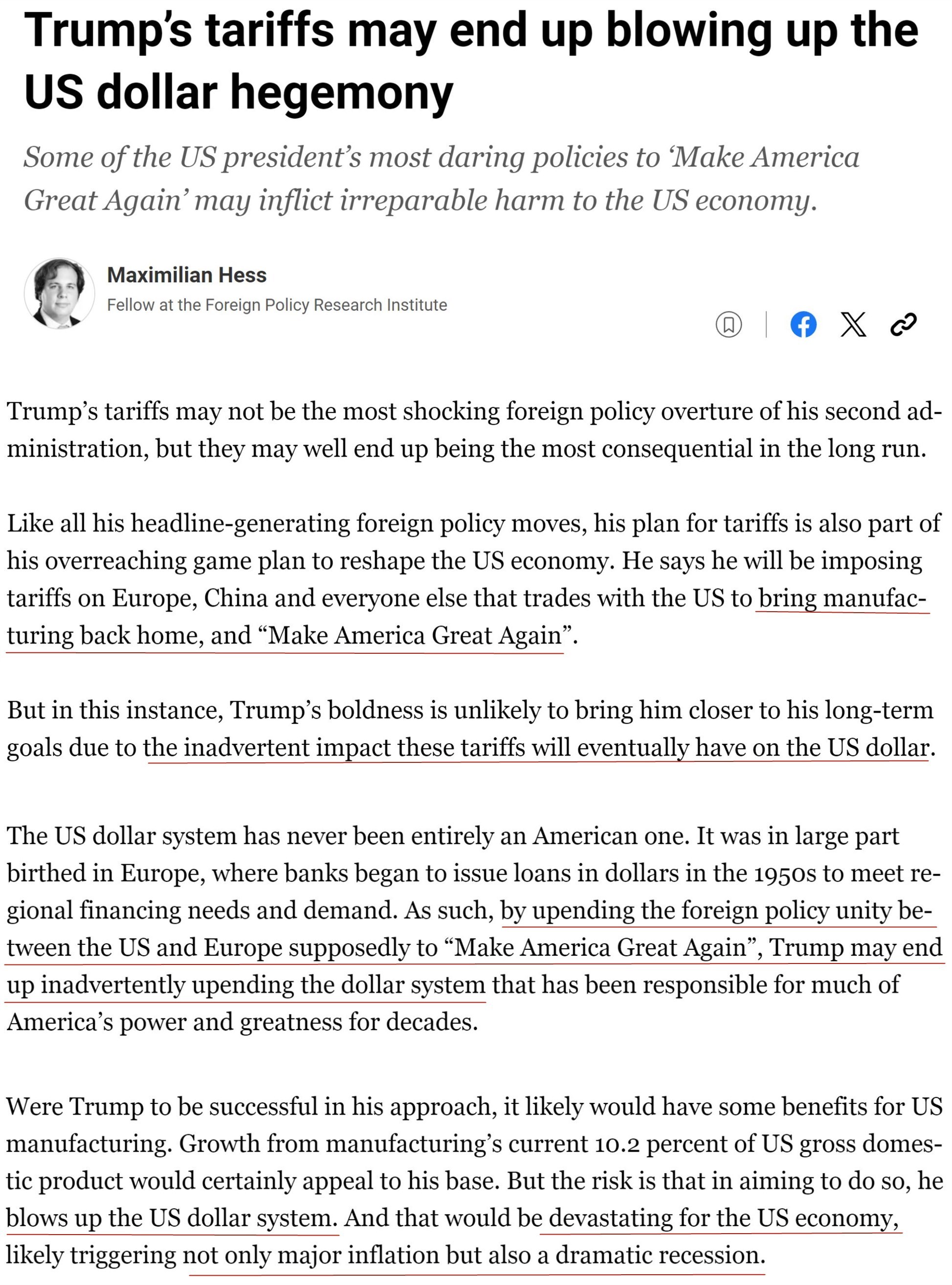 文章指出,一直以來(lái),全球?qū)γ涝男枨笫蛊涑蔀槊绹?guó)的主要出口產(chǎn)品。正是這種“過(guò)分的特權(quán)”使美國(guó)能夠在不對(duì)經(jīng)濟(jì)造成重大負(fù)擔(dān)的情況下長(zhǎng)期維持貿(mào)易和財(cái)政赤字。而如今特朗普政府的關(guān)稅政策可能最終摧毀美元霸權(quán),從而使美國(guó)經(jīng)濟(jì)遭到毀滅性打擊。