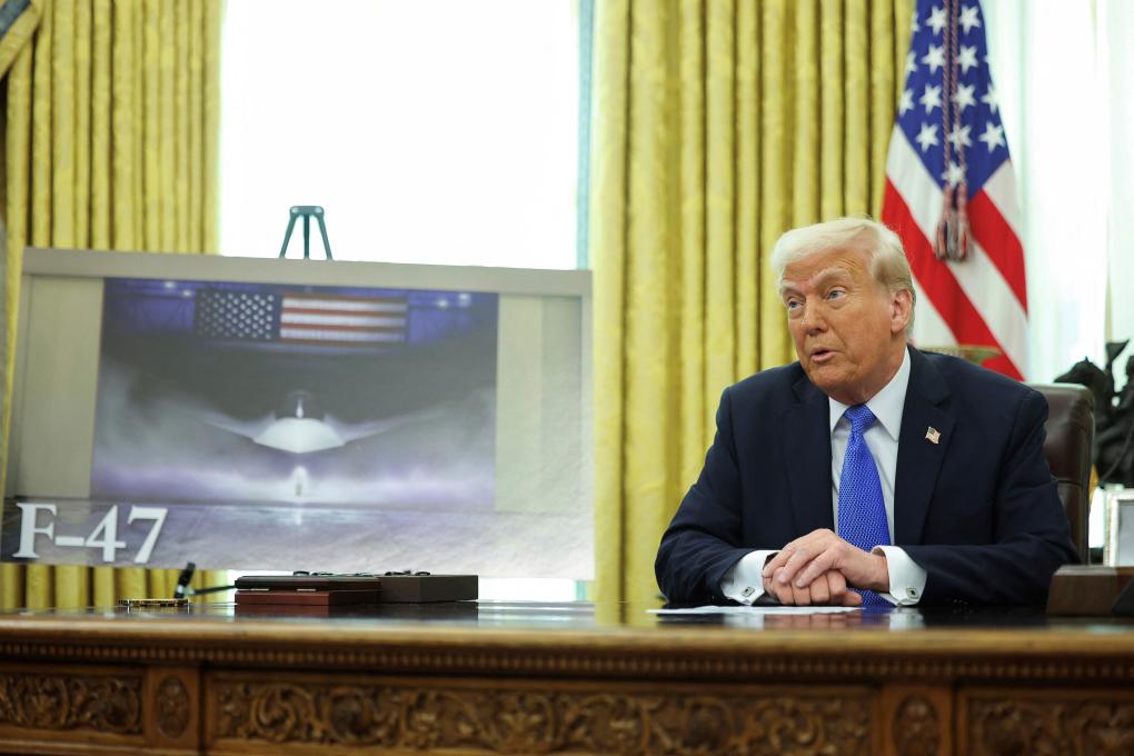 3月21日,美國(guó)總統(tǒng)特朗普在白宮一場(chǎng)活動(dòng)中發(fā)表講話并展示F-47戰(zhàn)斗機(jī)圖像。新華社/美聯(lián)