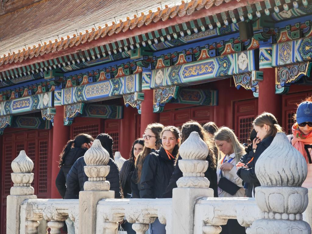 3月18日,美國艾奧瓦州高中生研學(xué)團(tuán)游覽北京故宮。新華社記者 馬卓言 攝