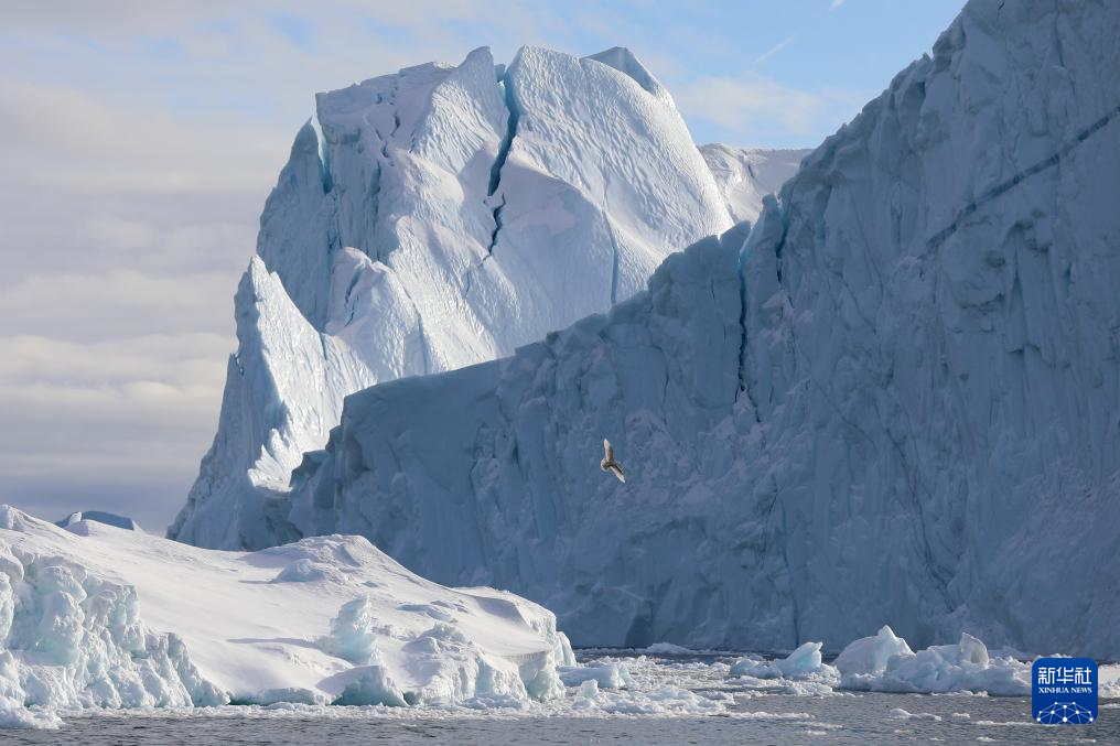 3月22日,在丹麥自治領(lǐng)地格陵蘭島迪斯科灣,一只海鳥(niǎo)從冰山旁飛過(guò)。新華社記者 趙丁喆 攝