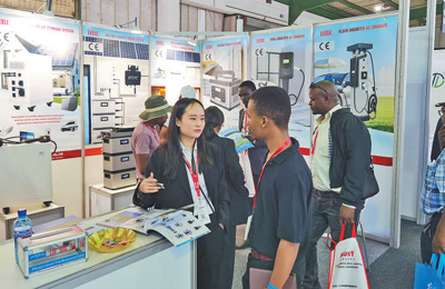 在一家中企展臺,工作人員在向非洲客戶介紹該公司最新光伏儲能設(shè)備及其應(yīng)用場景。