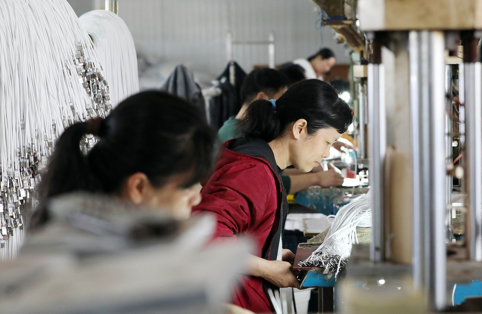 △廣西柳州一家電子廠生產(chǎn)車間,工人在生產(chǎn)線上加工數(shù)據(jù)線等電子產(chǎn)品。