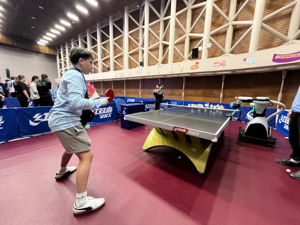 二樓體驗區(qū)的乒乓球發(fā)球機(jī)器人前,學(xué)生們輪番挑戰(zhàn)。曾在美國全國U14乒乓球比賽中拿下過第7名的瑞恩·特洛伊·李揮拍上陣,飛快的反應(yīng)速度引發(fā)伙伴們此起彼伏的歡呼和掌聲。