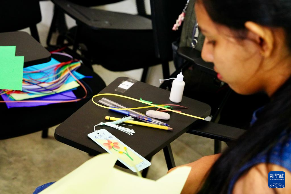 4月19日,在斯里蘭卡首都科倫坡舉行的聯(lián)合國中文日活動上,蘭比尼孔子課堂的學生學習制作衍紙書簽。新華社記者 伍岳 攝