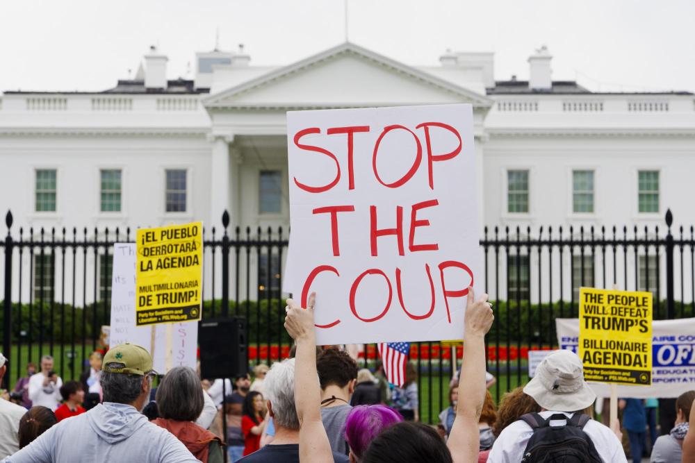 4月19日,人們在美國首都華盛頓白宮門前參加抗議活動。美國多地19日舉行抗議活動,首都華盛頓、紐約、舊金山、波士頓等城市的民眾走上街頭,抗議現(xiàn)政府大規(guī)模裁員、加征關稅、驅逐移民等政策。新華社發(fā)(亞倫攝)