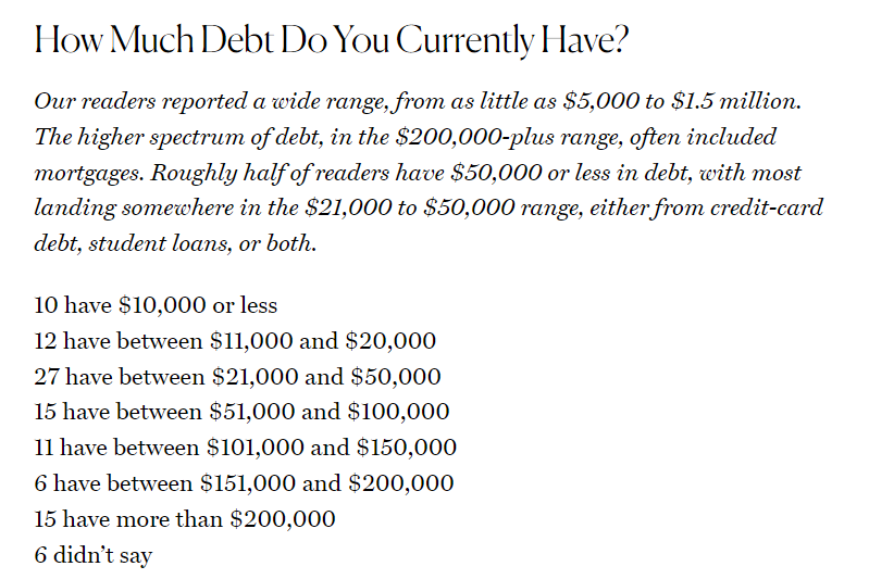 該網(wǎng)站針對102名讀者就個人債務(wù)問題進(jìn)行了調(diào)查,了解他們?nèi)绾伪池?fù)和償還債務(wù)。調(diào)查發(fā)現(xiàn),個人債務(wù)總額從5000美元到150萬美元不等,20萬美元以上的債務(wù)通常包含抵押貸款。約半數(shù)受訪者的債務(wù)在5萬美元及以下,最常見的債務(wù)范圍在2.1萬美元至5萬美元之間。