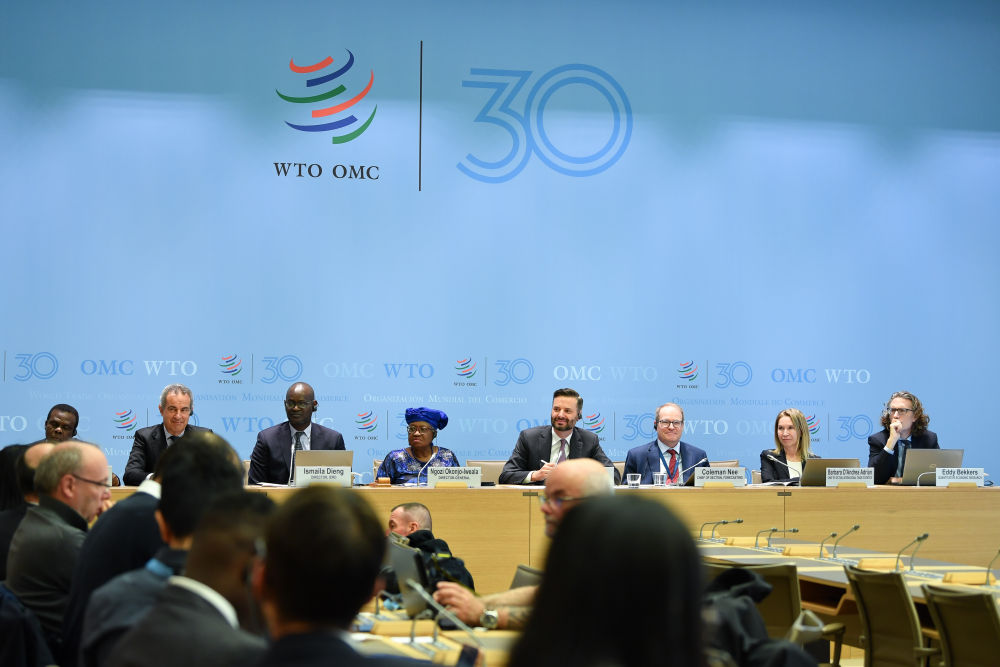 4月16日,在瑞士日內(nèi)瓦世界貿(mào)易組織總部,世貿(mào)組織總干事伊維拉(后排左四)出席新聞發(fā)布會。世界貿(mào)易組織16日發(fā)布的最新報告顯示,美國關稅政策導致全球貿(mào)易前景嚴重惡化。新華社記者連漪攝