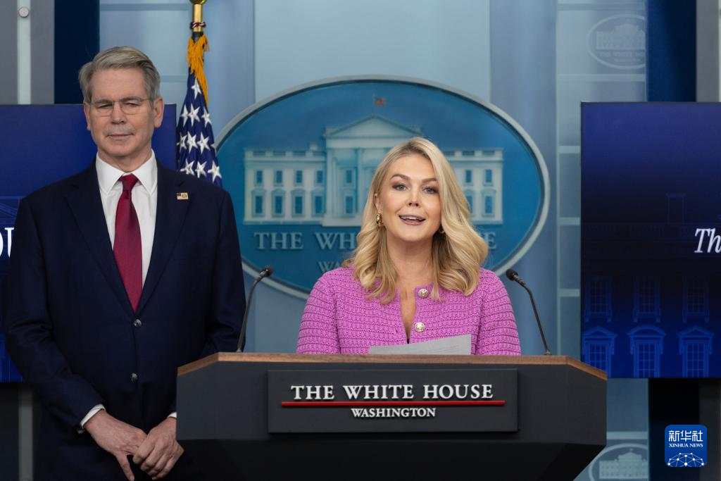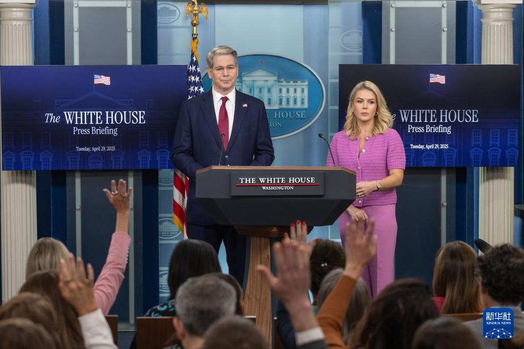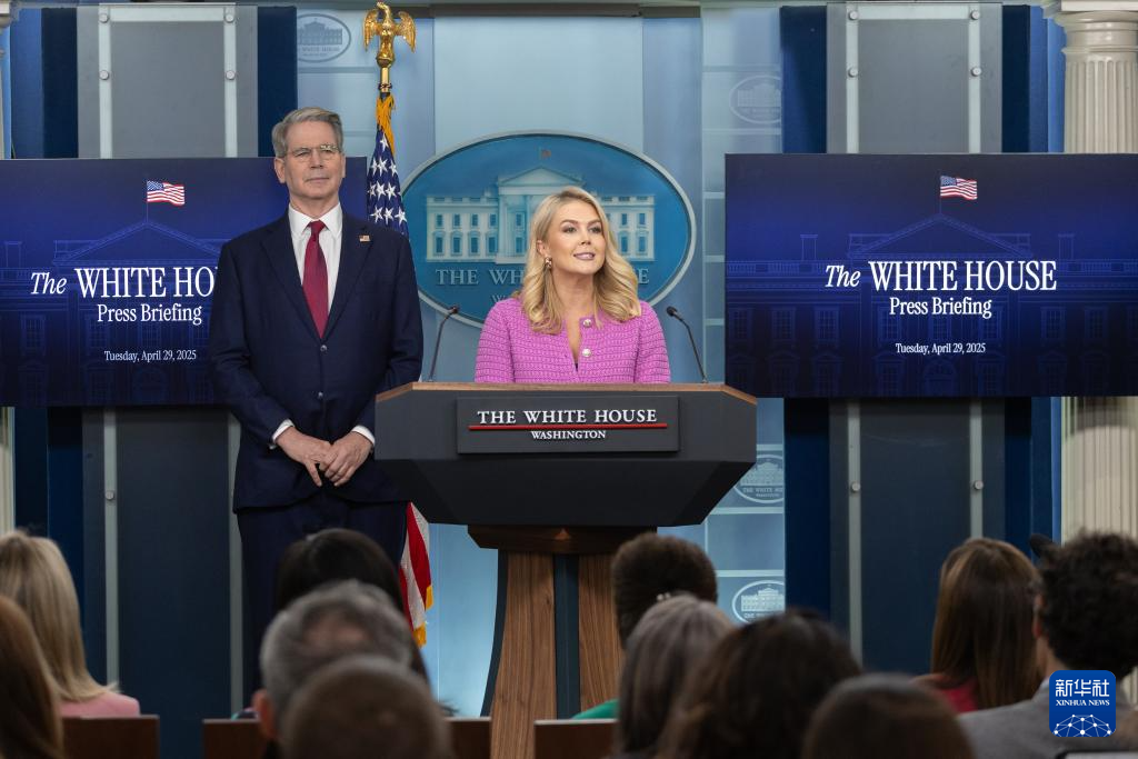 4月29日,美國(guó)白宮新聞秘書(shū)卡羅琳·萊維特(右)與美國(guó)財(cái)政部長(zhǎng)斯科特·貝森特在華盛頓白宮出席記者會(huì)。新華社記者 胡友松 攝