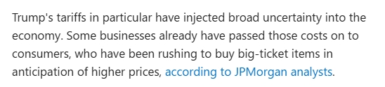 商界領(lǐng)袖們迫切希望美國的政策能有幾周的穩(wěn)定,美國農(nóng)戶們發(fā)現(xiàn)自己的聯(lián)邦食品補貼合同已經(jīng)終止,全美各地的非營利組織都在裁員,因為白宮正在削減開支。尤其是特朗普政府的關(guān)稅政策給經(jīng)濟(jì)帶來了廣泛的不確定性。摩根大通分析師表示,一些企業(yè)已經(jīng)將這些成本轉(zhuǎn)嫁給了消費者,消費者因預(yù)期價格上漲而搶購大件商品。