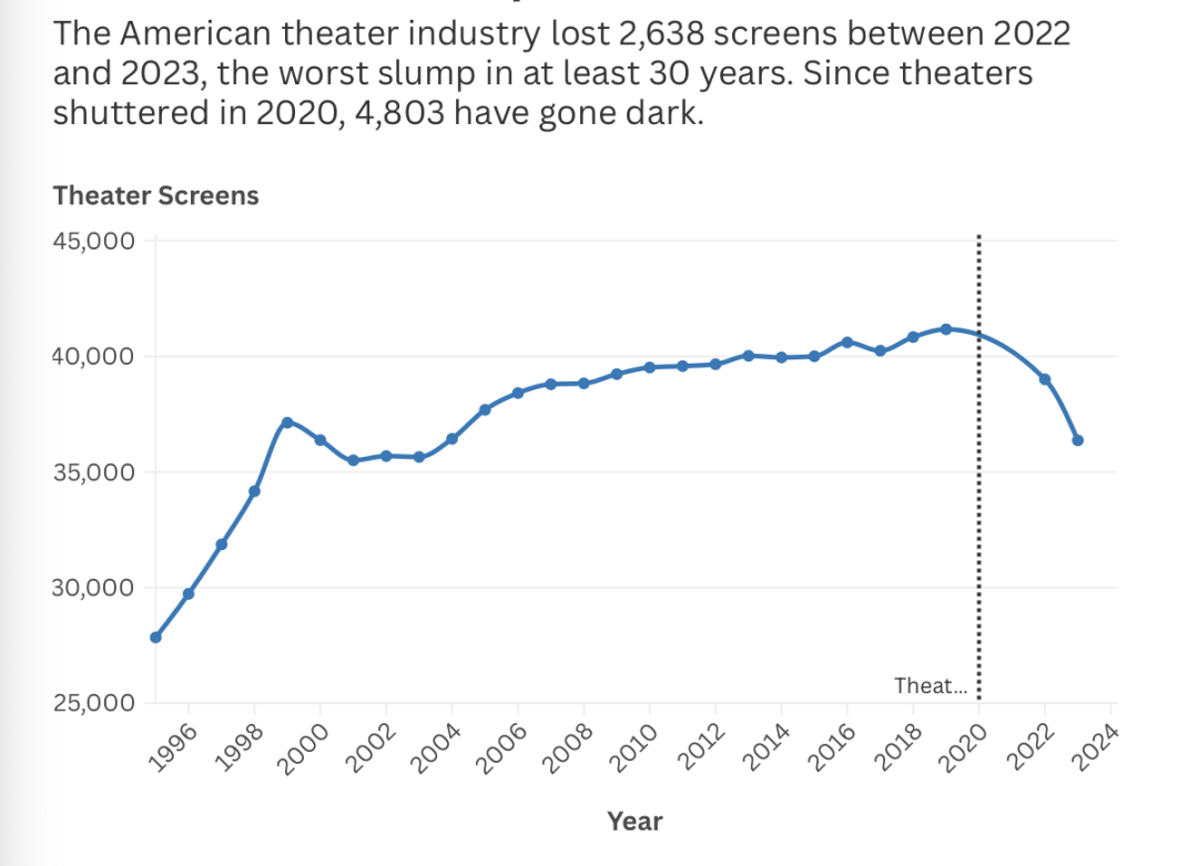 ?。?022年至2023年間,美國影院損失了2638塊銀幕,這個趨勢還在延續(xù)。