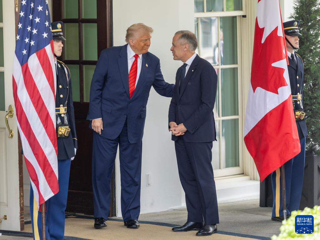 5月6日,美國總統(tǒng)特朗普(左二)在華盛頓白宮迎接到訪的加拿大總理卡尼。新華社記者 胡友松 攝