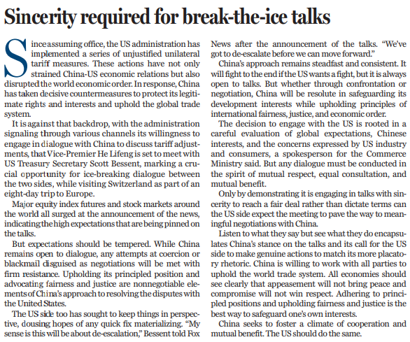 近期,美方不斷表示,希望同中方就關(guān)稅調(diào)整進(jìn)行談判。當(dāng)?shù)貢r(shí)間10日上午,中美經(jīng)貿(mào)高層會談在瑞士日內(nèi)瓦開始舉行。中共中央政治局委員、國務(wù)院副總理何立峰作為中美經(jīng)貿(mào)中方牽頭人,當(dāng)天與美方牽頭人、美國財(cái)長貝森特舉行會談。中美關(guān)稅戰(zhàn)迎來破冰契機(jī)。