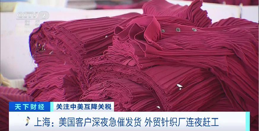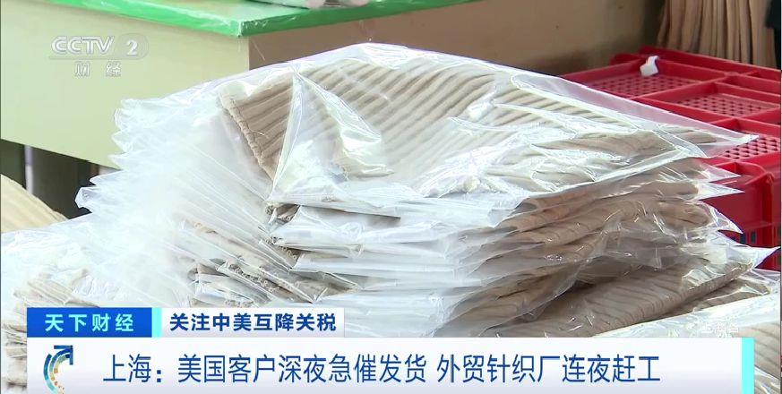 在中美大幅互降關(guān)稅后,位于上海松江區(qū)李塔匯鎮(zhèn)的一家針織廠,接到了美國客戶可以出貨的通知。已經(jīng)在包裝車間里堆了1個(gè)月的50000多件成衣,終于可以開啟最后的工序,車間內(nèi)的工人全員上崗,縫商標(biāo)、熨燙、打吊牌,各個(gè)工序有條不紊。