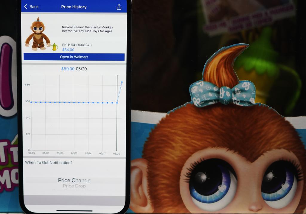 5月21日,在美國舊金山灣區(qū)圣利安卓San Leandro的一家沃爾瑪超市,價格跟蹤軟件(Walmart Tracker)顯示商品(中國產毛猴玩具)售價變化。新華社記者吳曉凌攝