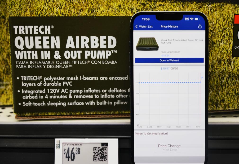 5月21日,在美國加利福尼亞州舊金山灣區(qū)圣萊安德羅的一家沃爾瑪超市,價格跟蹤軟件顯示一款中國產充氣床墊售價變化情況。新華社記者 吳曉凌 攝