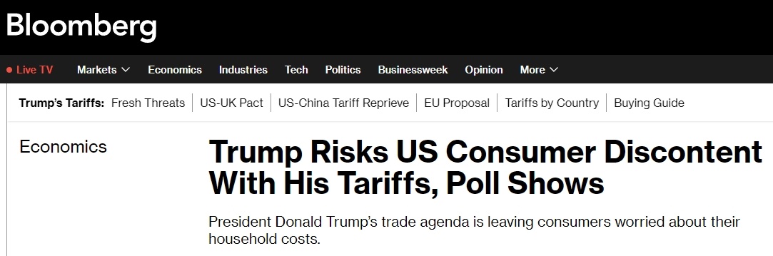 彭博社近日民調(diào)顯示,56%的受訪美國人認為,特朗普對其他國家征收的關稅對他們的家庭財務狀況產(chǎn)生了不良影響。即使特朗普政府一直在鼓吹加關稅能讓產(chǎn)業(yè)回流美國并增加財政收入,約52%的受訪者還是表示,美政府承諾的好處不值得他們?yōu)榇烁冻龅慕?jīng)濟代價。