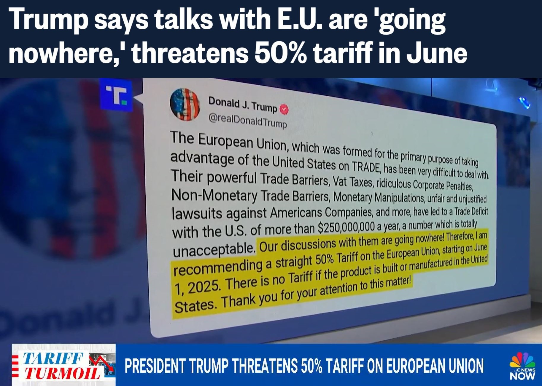 美國總統(tǒng)特朗普23日在社交媒體發(fā)文威脅稱,由于美國與歐盟的談判“毫無進(jìn)展”,他建議從6月1日起對來自歐盟的商品征收50%的關(guān)稅。