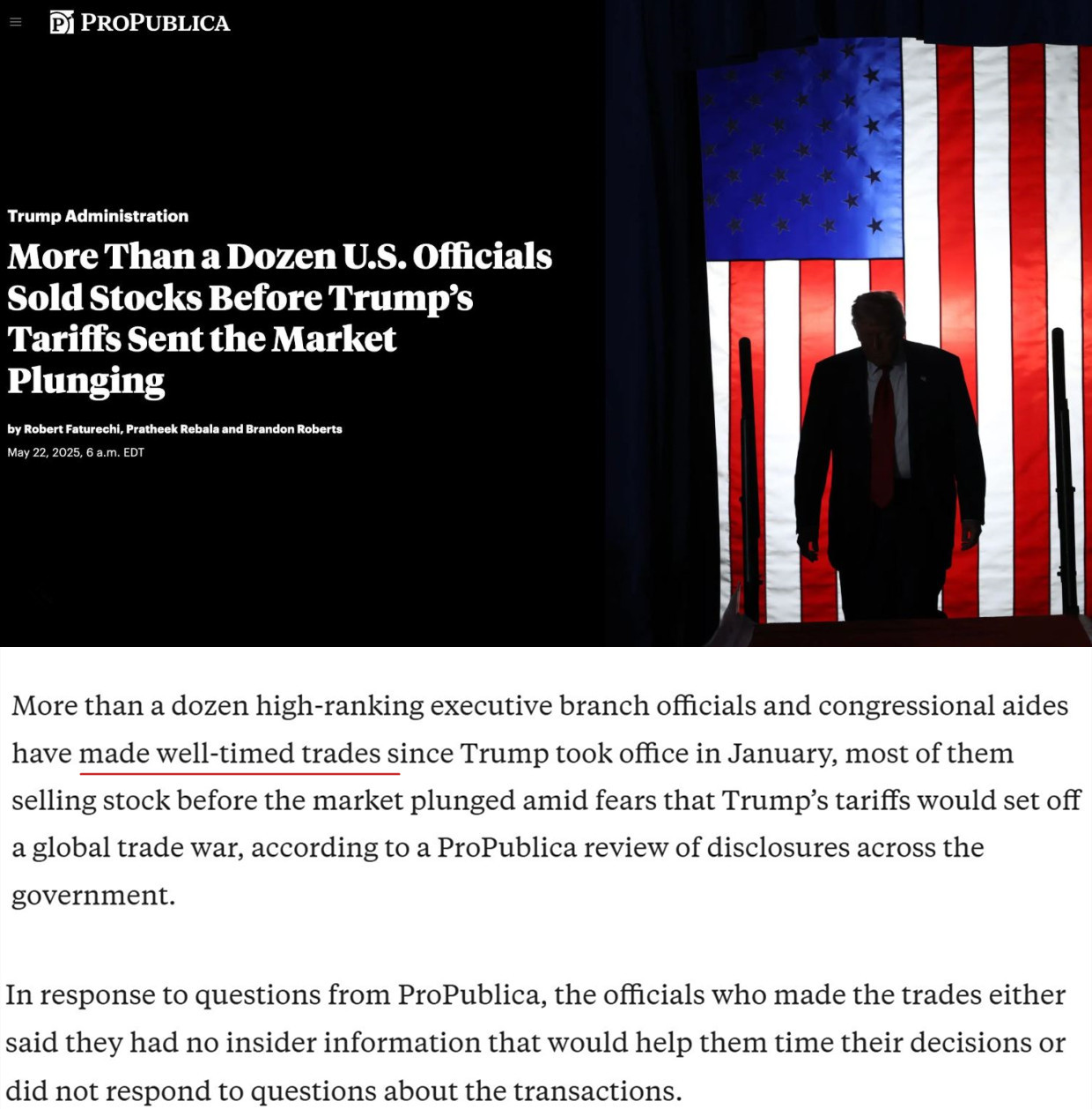 最近,美國“專業(yè)公眾”新聞?wù){(diào)查網(wǎng)站在查詢了數(shù)百份證券交易披露報(bào)告后發(fā)現(xiàn),自本屆美國政府1月上臺以來,有十幾名美國政府高級官員、國會工作人員乃至國會議員進(jìn)行了時(shí)機(jī)“恰到好處”的交易,其中大部分人在美國關(guān)稅政策導(dǎo)致市場暴跌之前拋售了股票;還有人則在相關(guān)法案獲批前“及時(shí)”購買了該法案所利好的行業(yè)公司股票。