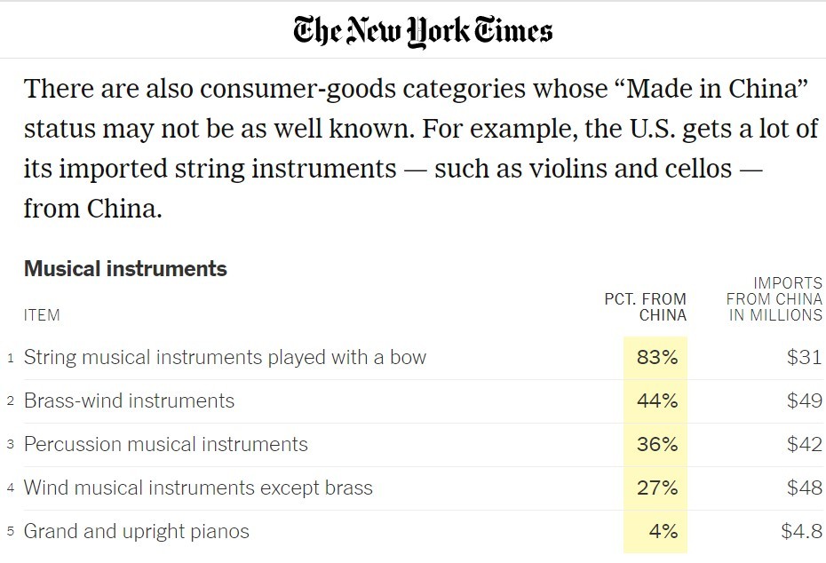 文章說,從清單中可以看出,美國從中國進口的主要商品都是消費品,覆蓋生活中的多個場景:你衣櫥中的領帶、手套和連褲襪幾乎都是從中國進口的;如果你是一名運動員,尤其是球類運動的運動員,那么你用的羽毛球、乒乓球、網(wǎng)球、健身房設備、泳池設備等都非常依賴“中國制造”;還有一些消費品類別的“中國制造”可能不那么廣為人知。例如,美國從中國進口了大量弦樂器,包括小提琴和大提琴。維生素及其衍生物也大量從中國進口,還有各種冷凍魚類,包括鰻魚、鱈魚、羅非魚等等。