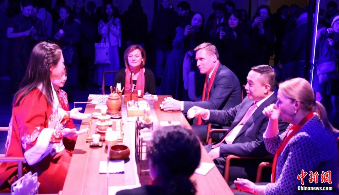 2025年2月13日,中國(guó)駐歐盟使團(tuán)在布魯塞爾燈光節(jié)組織“光影茶榭”活動(dòng),中國(guó)駐歐盟使團(tuán)團(tuán)長(zhǎng)蔡潤(rùn)(右排圖中)邀請(qǐng)嘉賓品茗,體驗(yàn)中國(guó)茶藝。中新社記者 德永健 攝