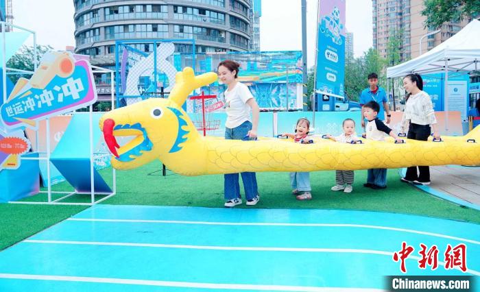 5月30日,市民游客在成都世運會“跟著賽事去旅行”武侯站體驗趣味旱地龍舟。成都世運會執(zhí)委會供圖
