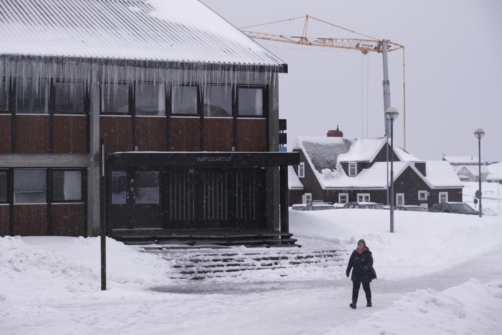 2025年3月24日,在丹麥自治領(lǐng)地格陵蘭島首府努克,一名行人經(jīng)過格陵蘭島自治議會(huì)。新華社記者張玉亮攝