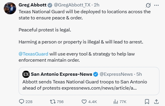 “和平抗議是合法行為,但傷害他人和損壞財產(chǎn)不合法,(肇事者)會被逮捕。”共和黨籍的阿博特在社交媒體上說,“得州國民警衛(wèi)隊將用一切方式方法,幫助執(zhí)法機構(gòu)維持秩序?!?/p>
