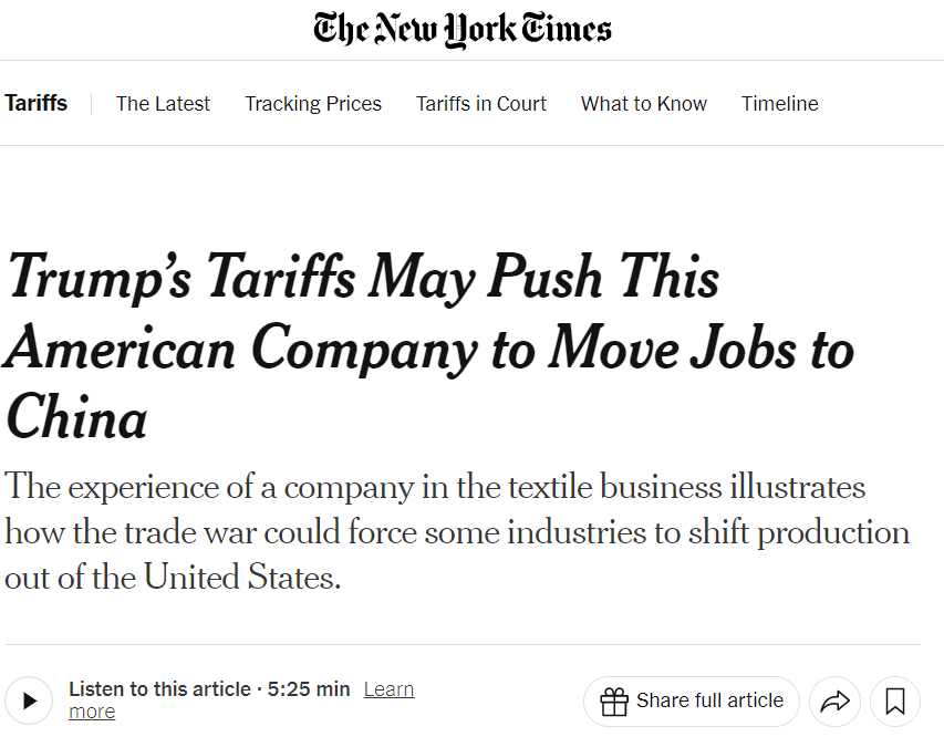 文章說(shuō),特朗普政府發(fā)起的全球貿(mào)易戰(zhàn)動(dòng)搖了Cocona Labs公司的經(jīng)濟(jì)基礎(chǔ)。受到美國(guó)關(guān)稅不確定性的影響,加之中國(guó)實(shí)施的對(duì)等反制措施,這家美國(guó)公司將開始做出改變:將其核心產(chǎn)品的部分生產(chǎn)從美國(guó)轉(zhuǎn)移到中國(guó)的工廠生產(chǎn)。