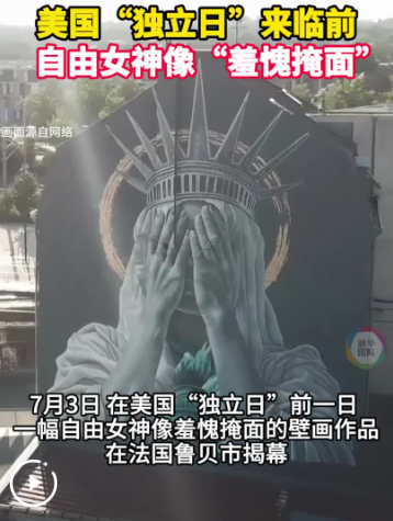 7月3日,在美國(guó)“獨(dú)立日”到來前一日,一幅自由女神像羞愧掩面的壁畫作品在法國(guó)魯貝市揭幕。