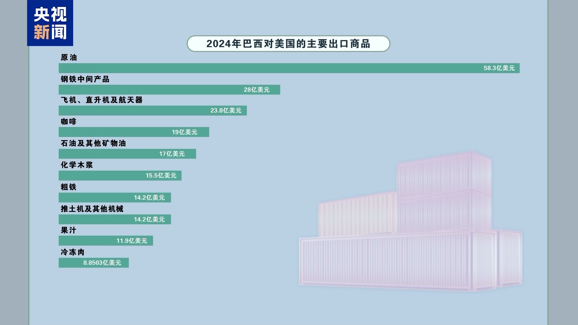 美國有線電視新聞網(wǎng)報(bào)道稱,2024年,巴西向美國出口了總額高達(dá)404億美元的商品??Х?、果汁、冷凍肉等美國民眾日常食物以及原油、粗鐵等基礎(chǔ)化工及能源商品都在排名前十內(nèi)。