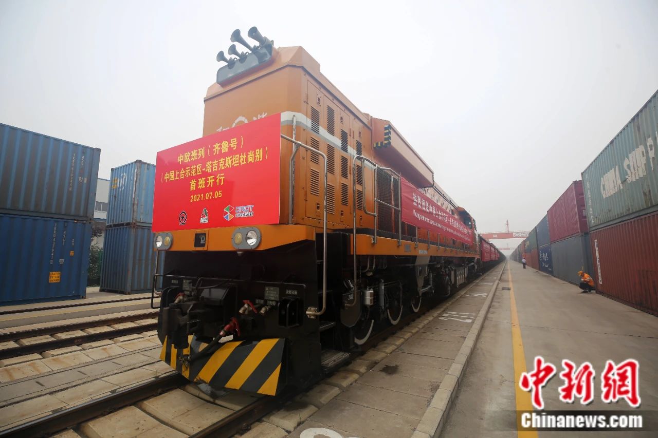 2021年7月5日, 中國—上海合作組織地方經貿合作示范區(qū)(簡稱“上合示范區(qū)”)前往塔吉克斯坦首都杜尚別的首班中歐班列(齊魯號)“上合快線”發(fā)出,從上合示范區(qū)青島多式聯運中心啟程。中新社記者 胡耀杰 攝