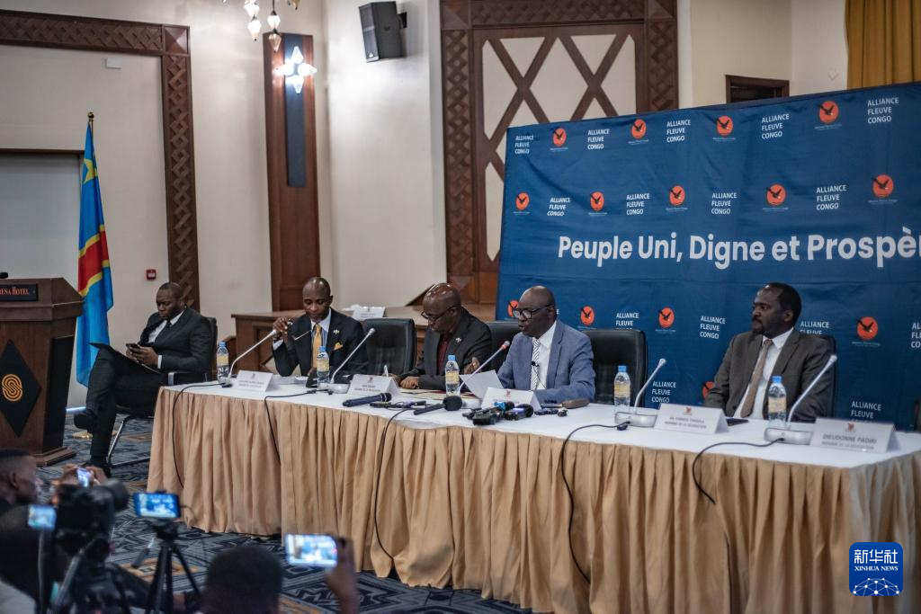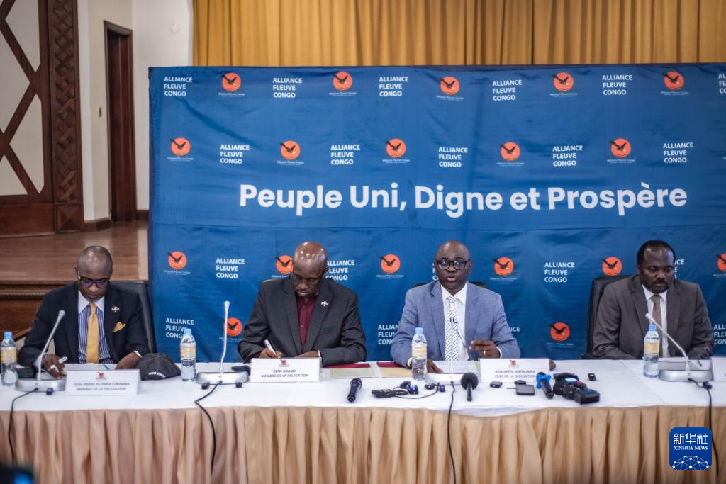 7月25日,在剛果(金)北基伍省首府戈馬市,“M23運(yùn)動”對話代表姆博寧帕(右二)出席記者會。新華社發(fā)(扎內(nèi)姆·內(nèi)蒂·扎伊迪攝)