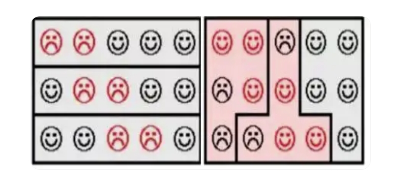 上圖是個(gè)簡(jiǎn)化的例子,通過不同的區(qū)域劃分,黑方在左圖的每個(gè)區(qū)域中都占據(jù)多數(shù),對(duì)紅方取得了3:0的優(yōu)勢(shì)。但按右圖的方式劃分,紅方反而取得了2:1的領(lǐng)先。